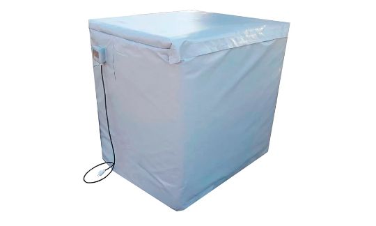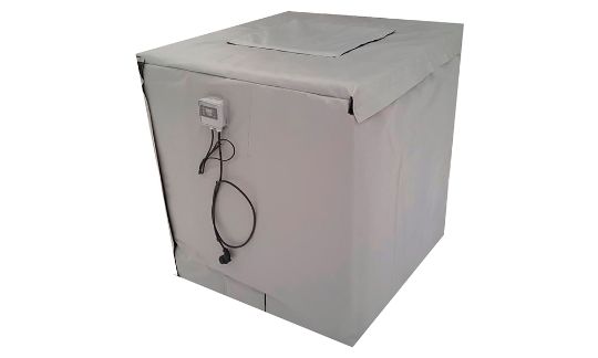 Термочехол содержит четыре пленочных нагревателя с боковых сторон и пять утепленных граней (утеплитель вспененный полиэтилен с отражателем): четыре боковых и одну верхнюю, цифровой терморегулятор c датчиком.